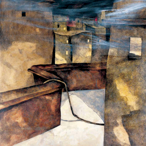As expected, the painting of Subhaprasanna decorated in the collection ‘Middletone’ is an unformidable representation of the streets and houses of Kolkata. It was crafted in the 1990s. The paintings feature zig-zag streets with houses lining either side. These symbols are a nod to the ever-growing labyrinth. The houses seem to have come alive. Nostalgic of their relationship with their occupants, they are now sorrowful and longing for the old days. This collection of Subhaprasanna paintings foreshadows the onset of apathy and distance permeated through the gentrification of the city.
