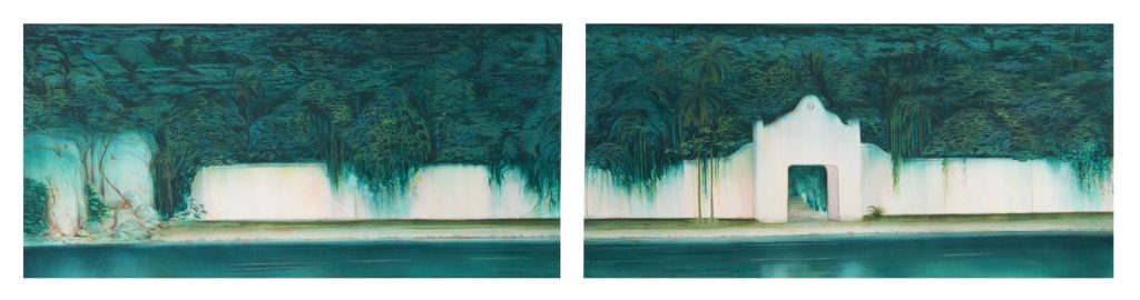 Sujith’s paintings convey the idea that vision is the creation of another world, which could also be a construction for another time. Deleuze discusses becoming, stating that ‘becoming does not tolerate the separation or the distinction of before and after, or of past and future.’ The space of an artwork is like an intersection between the past and the present. It is ‘becoming’ precisely when it is ‘atmospheric.’ An artwork is transforming into something else, into many things, into another being. The artist narrates the two states of the botanical garden here in two colour schemes. In one, there are various states(shades) of green—a state where green has turned melancholic. Otherwise, green is depicted in long-term colonial languor. The overlay of melancholy makes their inner meanings mysterious. A dreamy landscape that expresses the green’s pursuit of its mysterious meanings, its urgency and capability to spread beyond colonial limitations. Yet, certain elements that make things even more mysterious—the green of various trees, some of which seem ancient and others hanging expansively—make the greenery even more enigmatic. What resonates through the symbol of introspection should not be limited to meditation alone; here, the greenery not only adorns the trees but also, beyond calling forth the grandeur of a botanical garden through its colour, takes a journey into colonial interpretations through the conceptual framework of Hortus Malabaricus. The underplay of time, history and the personal is intertwined here. That’s how the atmosphere becomes relevant. The first one is the artist’s reply to the oppressive and binding colonial period. The horthus malabaricus pre-text is nothing but his expression of figuring out and, at the same time, breaking away from coloniality. The white wall, which is actively limiting the growth, is visible, and it clearly represents the “all-encompassing white sentiment”.However, the greenish flora and fauna growing within it are expanding beyond its boundaries. So the notion of boundary is in question here. An artist here is experiencing and experimenting with history, which now becomes a personalised narrative of history. According to the artist’s spectacle, the post-colonial world is the greenery within, which is outgrowing and outshining the white exterior. Here, the history becomes personal. The binary opposition of official and personal is what makes the first painting attractive.