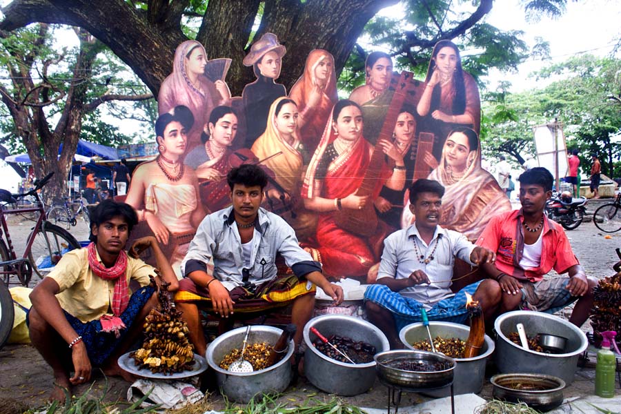 In the series Retake: Galaxy of Musicians, Raja Ravi Varma’s subjects undergo a centennial migration, transcending the gilded confines of the nineteenth-century frame to engage with the contemporary subaltern. Through the deployment of large-scale cut-outs, the work collapses the distance between the classical canon and vernacular life. As these figures embark on a peripatetic journey through urban and rural landscapes—intersecting with fish vendors, construction workers, and local youth—the project instigates a radical re-reading of ‘the classical.’ It effectively dissolves the boundary between historical artefact and contemporary social practice, questioning how the classical gaze survives when confronted by the grit of the everyday.