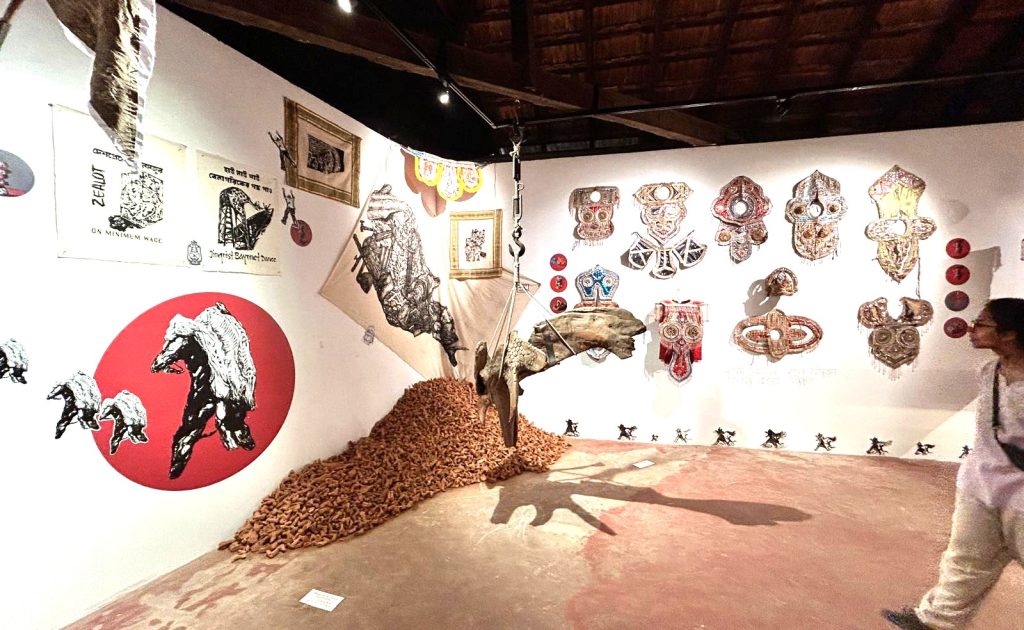The Panjeri Artists’ Union is an anti-caste art collective based in Banipur, West Bengal, through their project, ‘Assemblies of Hope Amidst the Death-Worlds: A 100-Day Work Proposition’, which is a central highlight of the 6th Kochi-Muziris Biennale (2025–2026). This project, set up at the front of the main venue, Aspinwall House, is an ‘assemblage’ that points to this era and its ‘shady’ incarnations. It critically examines and artistically educates contemporary audiences about caste and its various articulations.