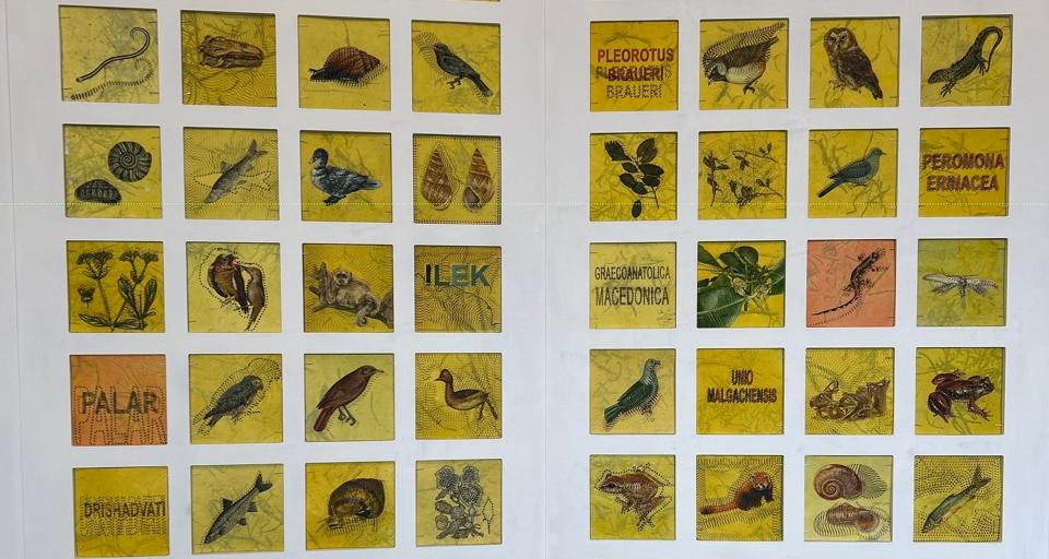 Singh’s panels feature several endangered and extinct species drawn from the International Union for Conservation of Nature’s Red List of Threatened Species. These include the harvestman species Hirstienus nanus, the white blotched shrub frog, the land snail Carelia mirabilis, the Mauritian giant skink, and the angled flat top snail.