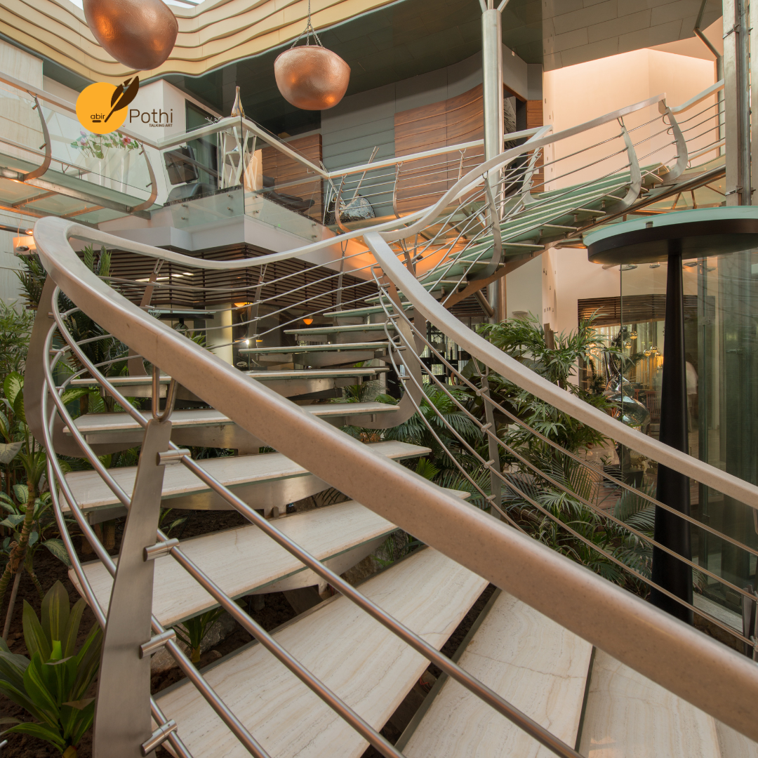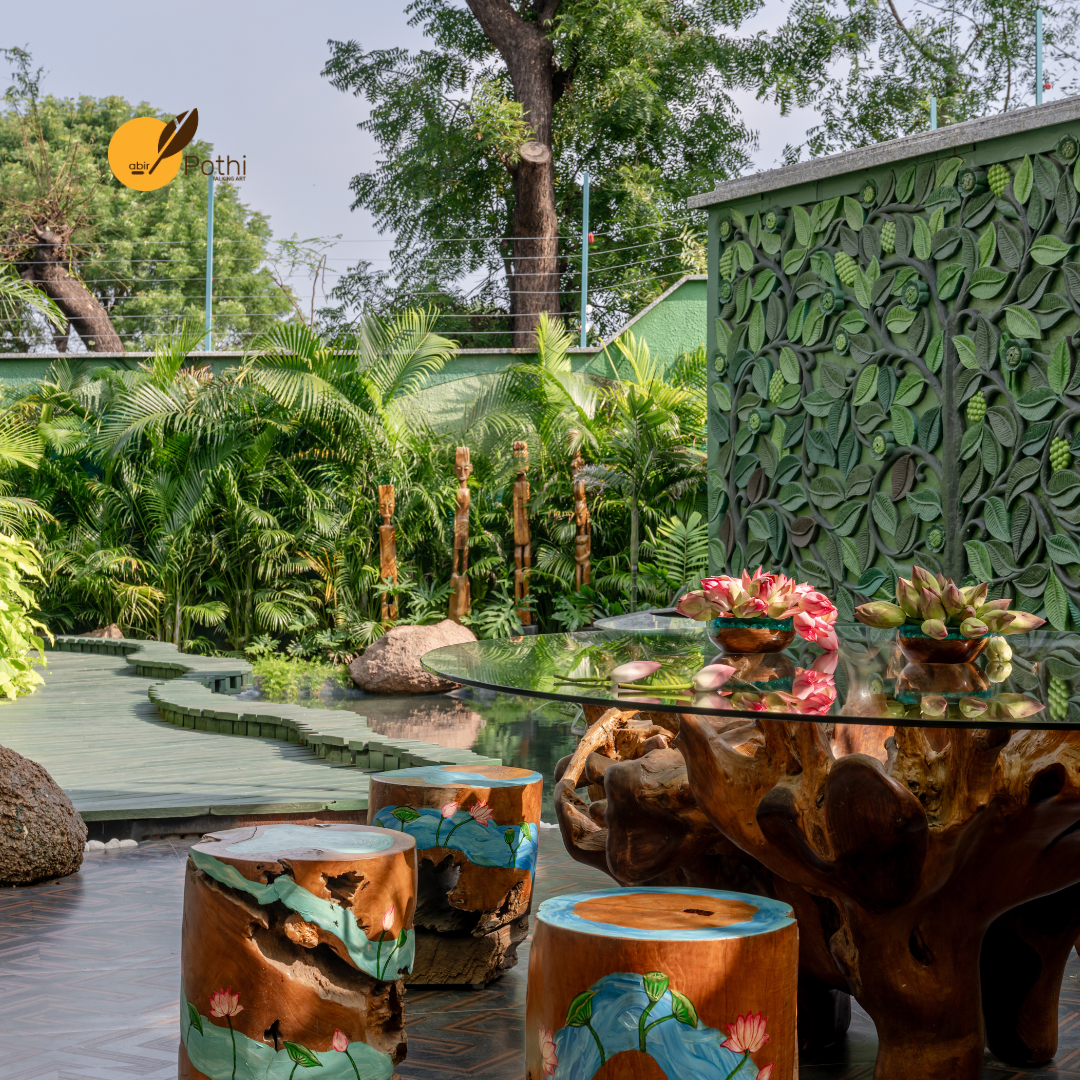 From the china mosaic entrance floor illuminated by glass orbs to the coloured skylight mural in the dining area, and from hand-painted backdrops in the bedrooms to lotus motifs in the patio, the boundaries between art, architecture, and nature have been gently blurred, allowing the house to be experienced as a unified artistic expression.