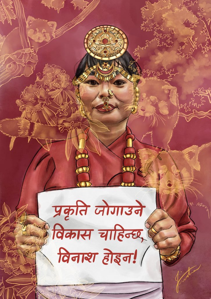 Krisha Joshi is an artist, designer, and illustrator from Kathmandu. Her poster pays homage to Mukkumlung, a sacred land of the Yakthung (Limbu) community under threat from the Pathibhara Cable Car Project. Through her art, she amplifies voices resisting displacement and environmental destruction.