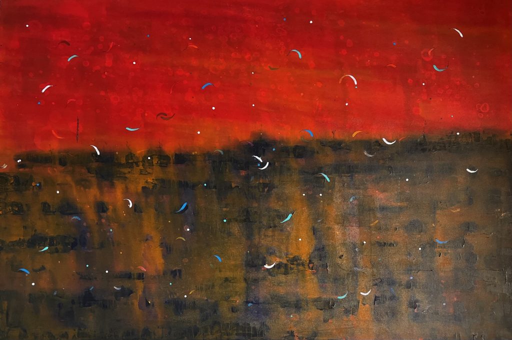 Extending this visual dialogue are Naman’s figurative paintings and Anamika’s abstractions. Naman’s works explore the charged physicality of the human form—its weight, its silences, and its hidden emotional registers. Meanwhile, Anamika’s layered canvases, driven by movement, texture, and shifting hues evoke the mutability of feeling itself.