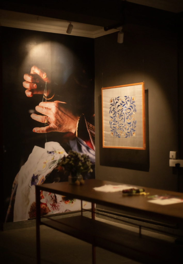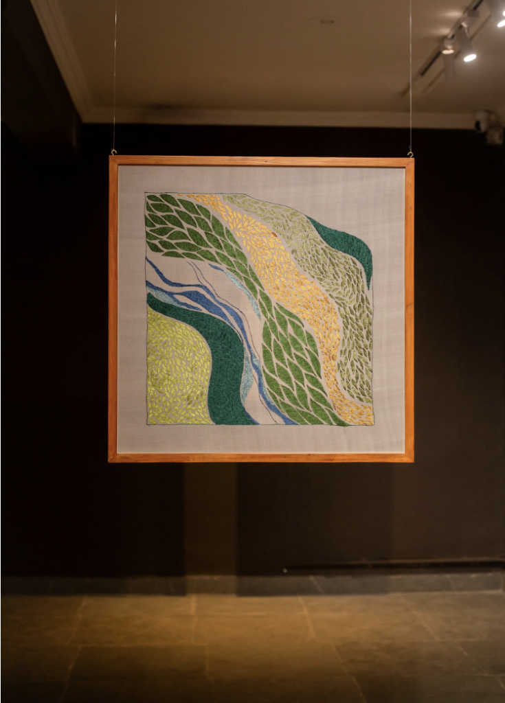 At its core, the exhibition draws from the ecological and cultural landscape of Chamba, where terraced fields shape both geography and daily life. This sensibility translates seamlessly into the rumals on display. The square textile becomes a field: stretched, worked upon, and slowly transformed through the repetitive, almost meditative act of embroidery.