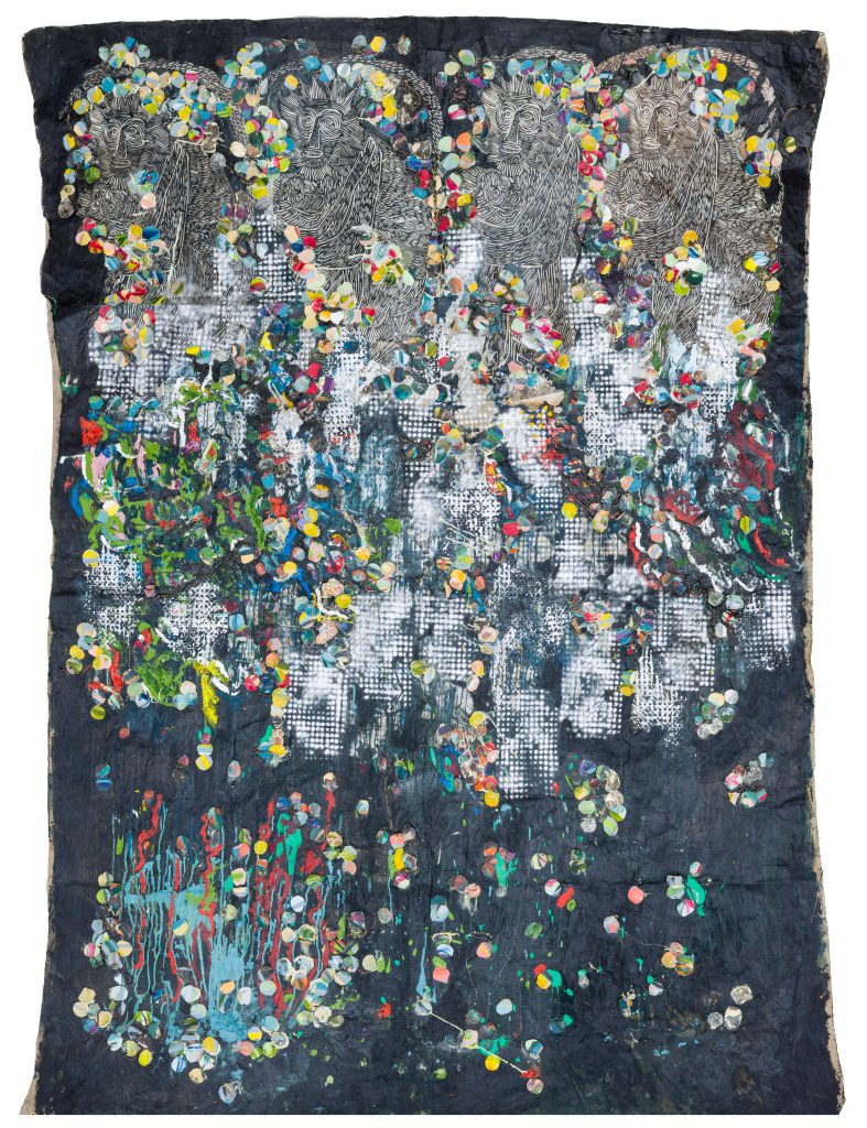 Central to the work are two recurring motifs: rice and coral. Rice represents survival in the Global South, while coral serves as a witness to the climate crisis. Tilda rice packets—a common commodity—function as a metaphor for the interconnected histories of trade, migration, and empire. The mixed-media compositions employ textured, layered surfaces that evoke ocean topography, with some pieces shimmering like water. Titles drawn from Japanese haiku contribute to the poetic quality of the work.
