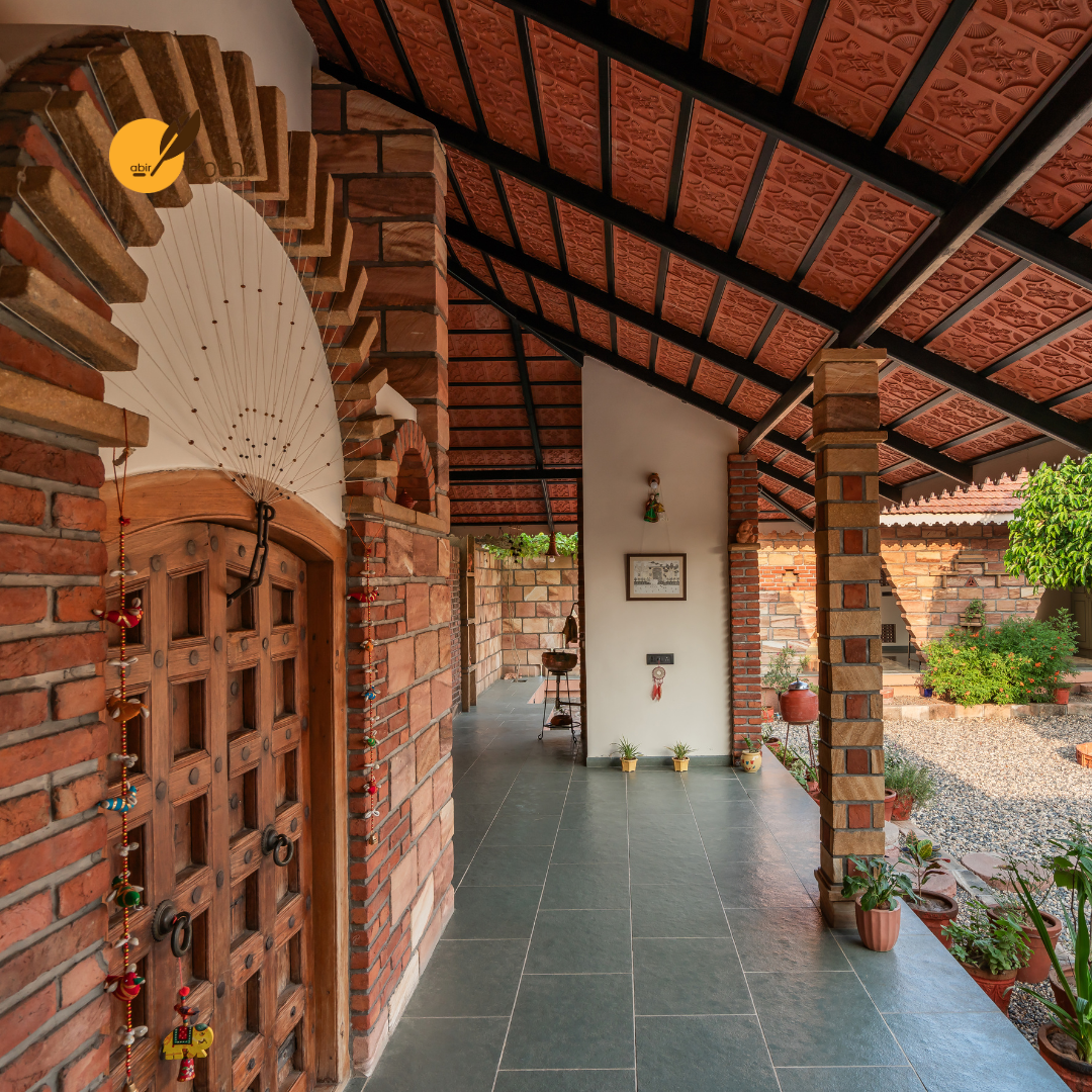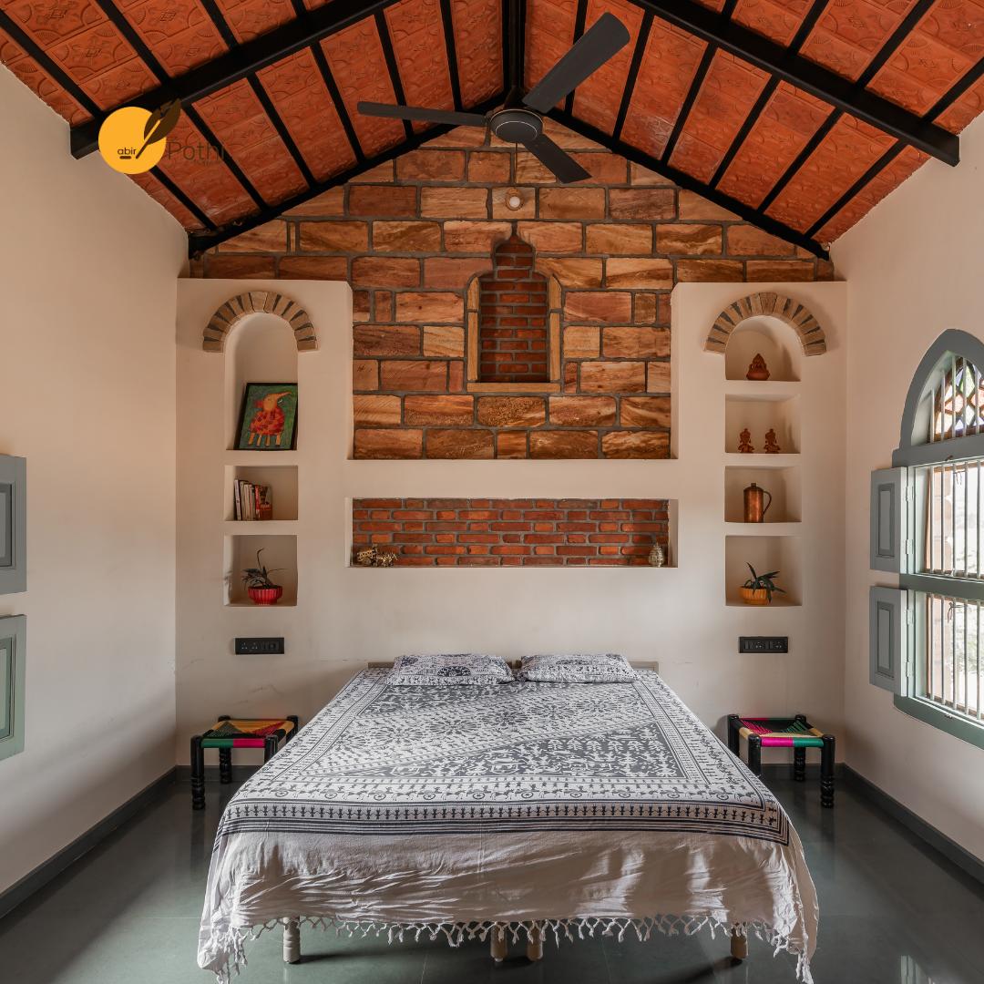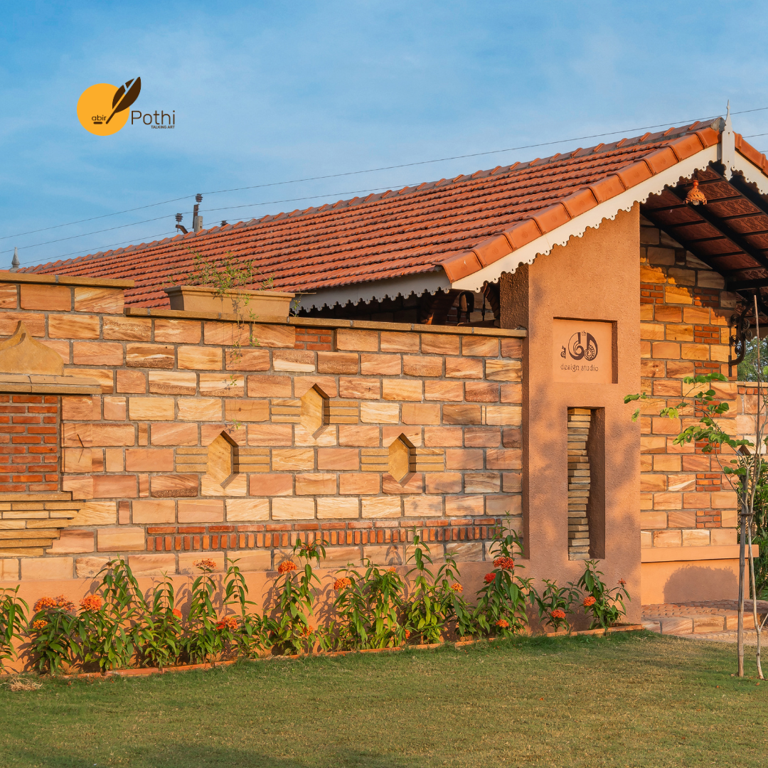 Planning has been kept inward-looking, with views directed toward the courtyard rather than outward. The three building blocks—studio, residence, and multipurpose hall—form an L-shaped layout, unified by local brick, stone, terracotta tiles, and coloured glass. Climate-responsive features such as small openings, recycled jaalis, terracotta screens, and traditional triplet windows support comfort and sustainability.