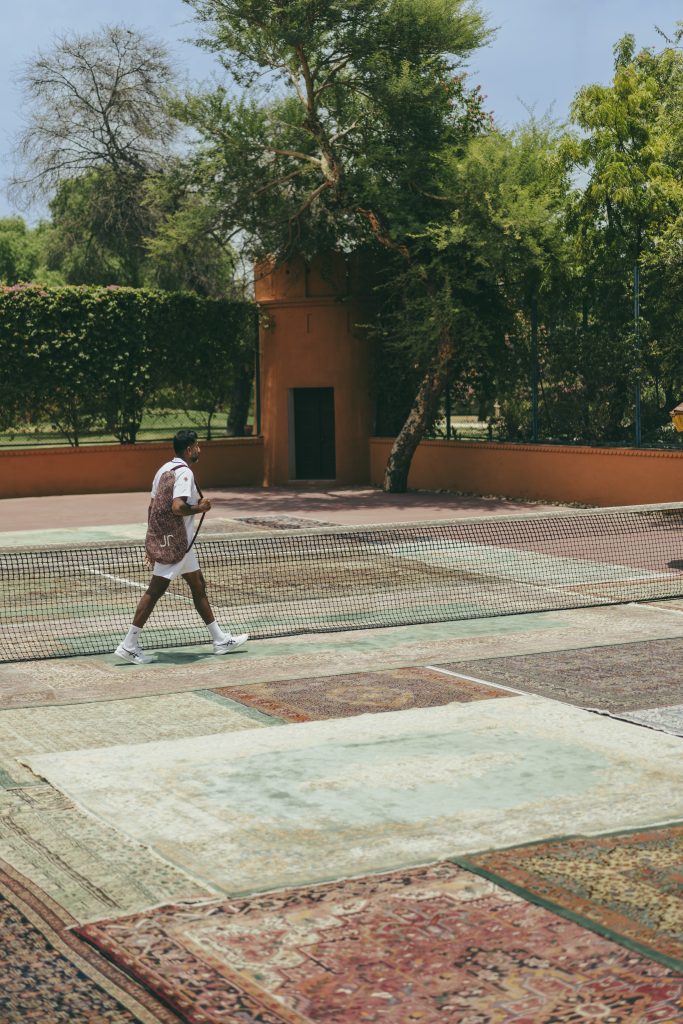 Jaipur Rugs presents Court of Carpets, recreating its 2024 campaign with tennis player Rohan Bopanna. The installation features a carpeted court with a knitted yarn net, tennis balls of New Zealand wool, and rackets strung with bamboo silk, connecting the craftsmanship of its 40,000 artisans (85% female) with contemporary culture.​