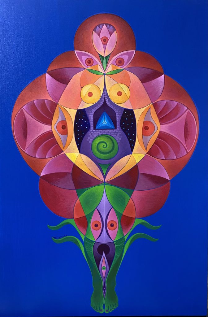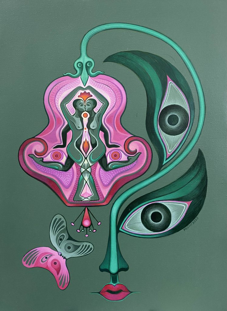 Born in 1971, Meena Sansanwal graduated and post-graduated in painting from the Delhi College of Art in 1994 and 1997, respectively. Deeply rooted in Indian cultural motifs and folk imagery, her vibrant and intuitive practice blends tradition with contemporary sensibility. Through her works, Sansanwal explores the union of nature, body, and cosmos—portraying the feminine as both earthly and divine.