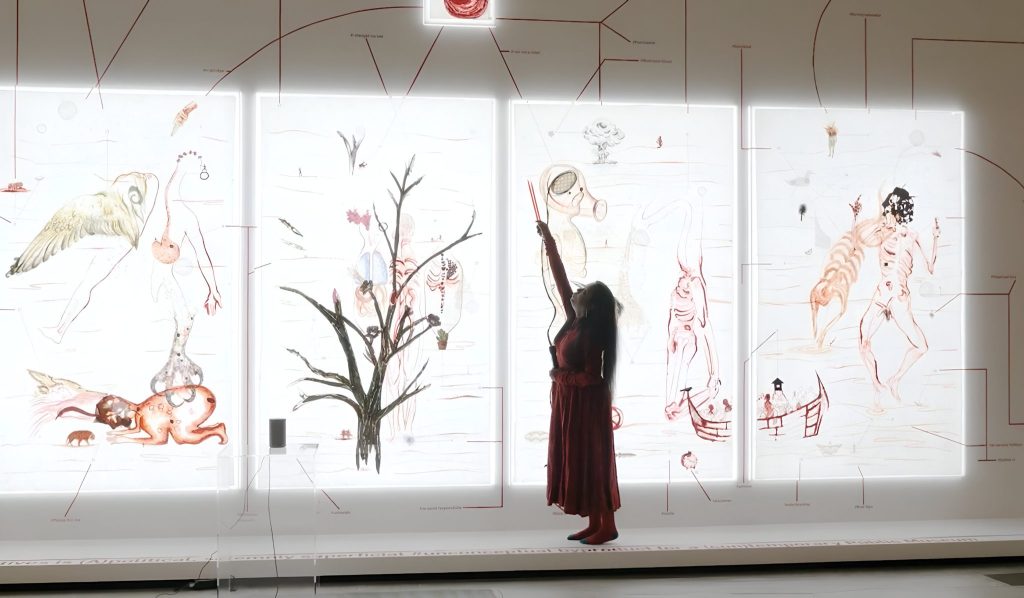 And then there is Mithu Sen, who moves effortlessly across drawing, sculpture, text, sound, performance, and invented languages. Her performances—often playful, vulnerable, unsettling, or tender—question identity, intimacy, hierarchy, and belonging. Whether she whispers, disrupts, or provokes, her voice carries a common thread: a refusal to accept fixed meaning. She creates a space where language dissolves and new emotional codes begin to form.