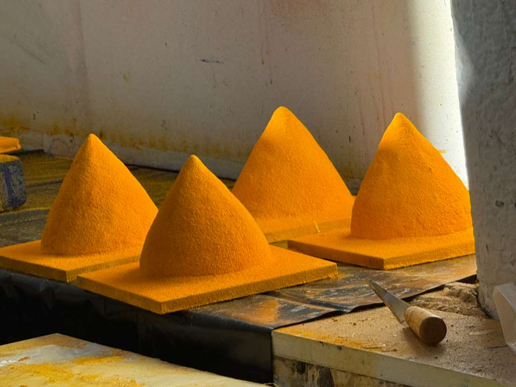 Kumar’s practice, informed by years of research across archaeological sites and traditional craft communities, investigates relationships between matter, motion, and memory. In Sifr, she focuses on elemental forms such as the cone, symbolizing movement and continuity through layered pigment and texture.