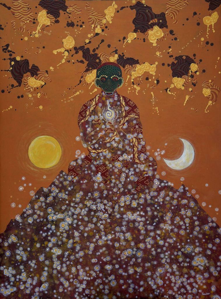 Bhutan’s cultural heritage, steeped in Buddhist philosophy, forms the backdrop of Tintin’s artistic practice. As a self-taught artist immersed in this deeply spiritual atmosphere, he brings together traditional thangka aesthetics with modern abstraction, creating a visual language at once personal and universal.