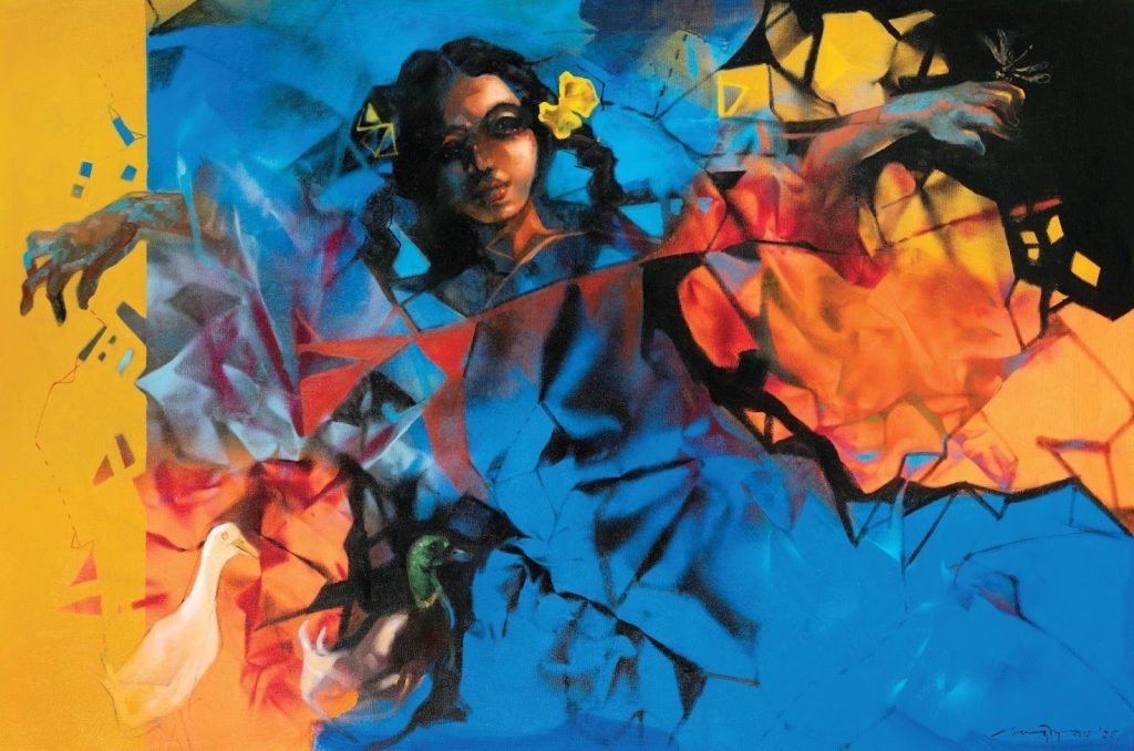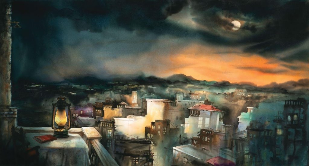 Roy’s realistic watercolours form a strong anchor within the exhibition. These works display his well-known command over light, atmosphere, and surface, yet they never slip into photographic exactness. Figures, landscapes, and interiors appear suspended in time, as if recalled rather than observed. There is a softness to their presence, a sense that the images are aware of their own fragility. The realism here is not performative. It does not seek to impress through technical virtuosity. Instead, it holds emotion gently, allowing memory to inhabit form.
