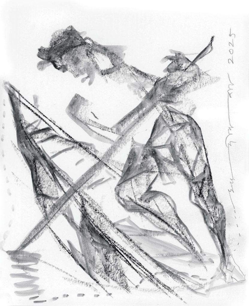 The graphite works introduce a more introspective tempo. Often pared down and restrained, they feel closer to private notations than finished declarations. Lines hesitate, repeat, and sometimes dissolve, mirroring the uncertain movement of thought and recollection. These works carry a raw immediacy that contrasts with the compositional calm of the watercolours. They suggest moments where form is still searching for itself, where certainty remains provisional.