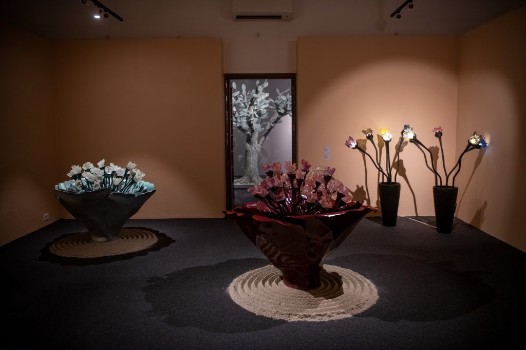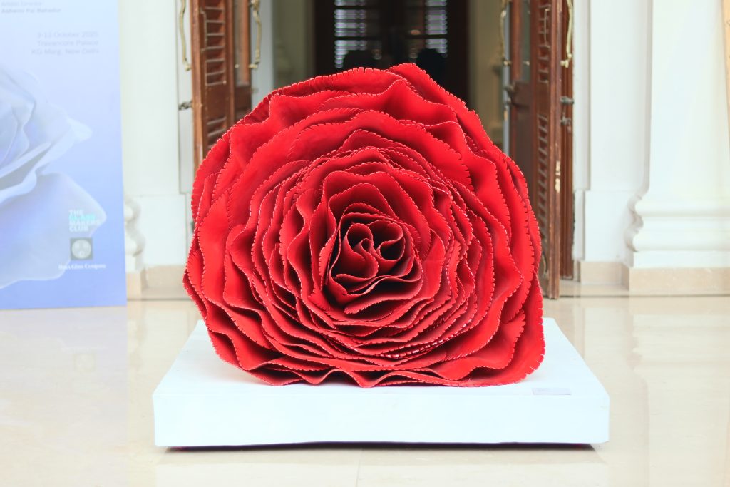 Goa: The vibrant semi-urban environment and flower markets inspire works like “Five Shades of Red,” paying tribute to the lives and spirit of Goan flower sellers through layered compositions of fibreglass and cast glass.
