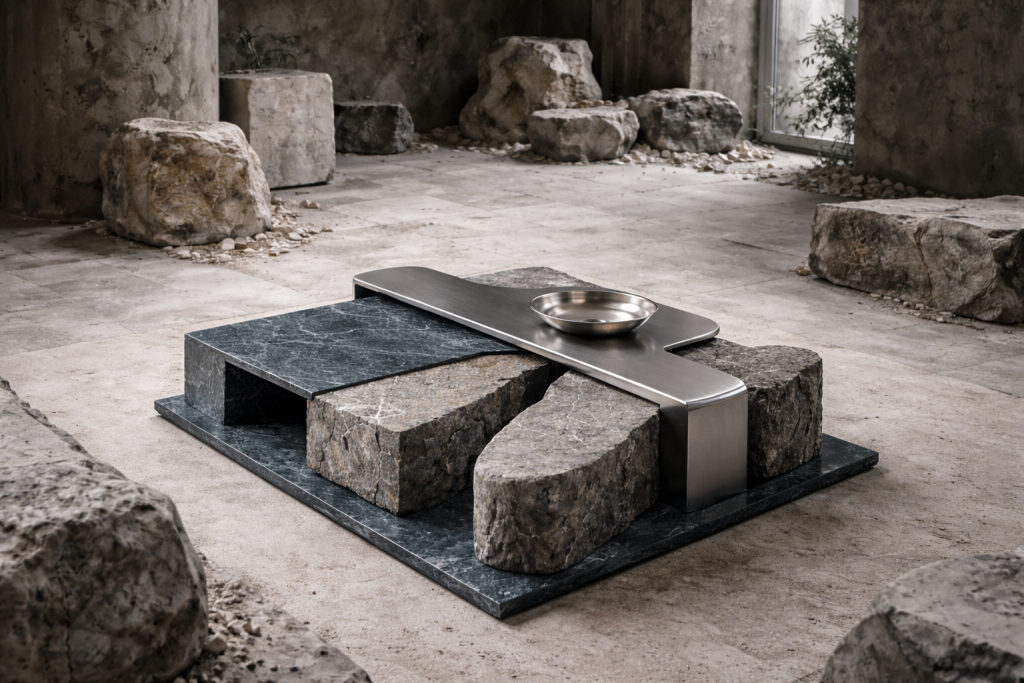 The installation emerges as a unified environment composed of four interlinked elements. Sculptural furniture crafted from stone, metal, and glass probes the relationships between weight, balance, and support. Vertical light columns create a rhythm of glow that defines atmosphere rather than illumination. Underfoot, a hand-dyed textile floor extends onto the walls, imbuing the space with pigment, gesture, and a trace of time.