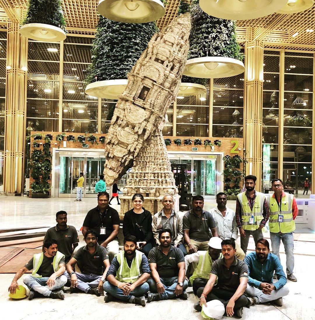 “The piece has been recently installed. The airport authority wanted some work based on the concept of navarasa. How to go about it was the challenge so I went with the idea of vimana itself, which when taken literally, we usually think of an airplane or an aircraft. But it has a different meaning as well. Mana is a measurement and vimana is something beyond the human reach. In ancient time, vimana was used to describe something that was beyond us or beyond our comprehension. Moreover, if we trace back to our ancient history, the biggest or most important structure among a group of people was the temple, and this temple was called the vimana. Apart from that, when we say vimana, it is usually fantasy or imagination, that involves flying objects as well. And I thought this idea fits very well with the airport area which is why I went with it. And it also talks about the ancient architecture. Moreover, it is also a tilting or moving structure. It is as though the architectural part lost its gravity; that way it is a kind of non-verbal communication. It seems like its floating or flying around and is meant to give you a feeling of lost gravity” said Tallur.