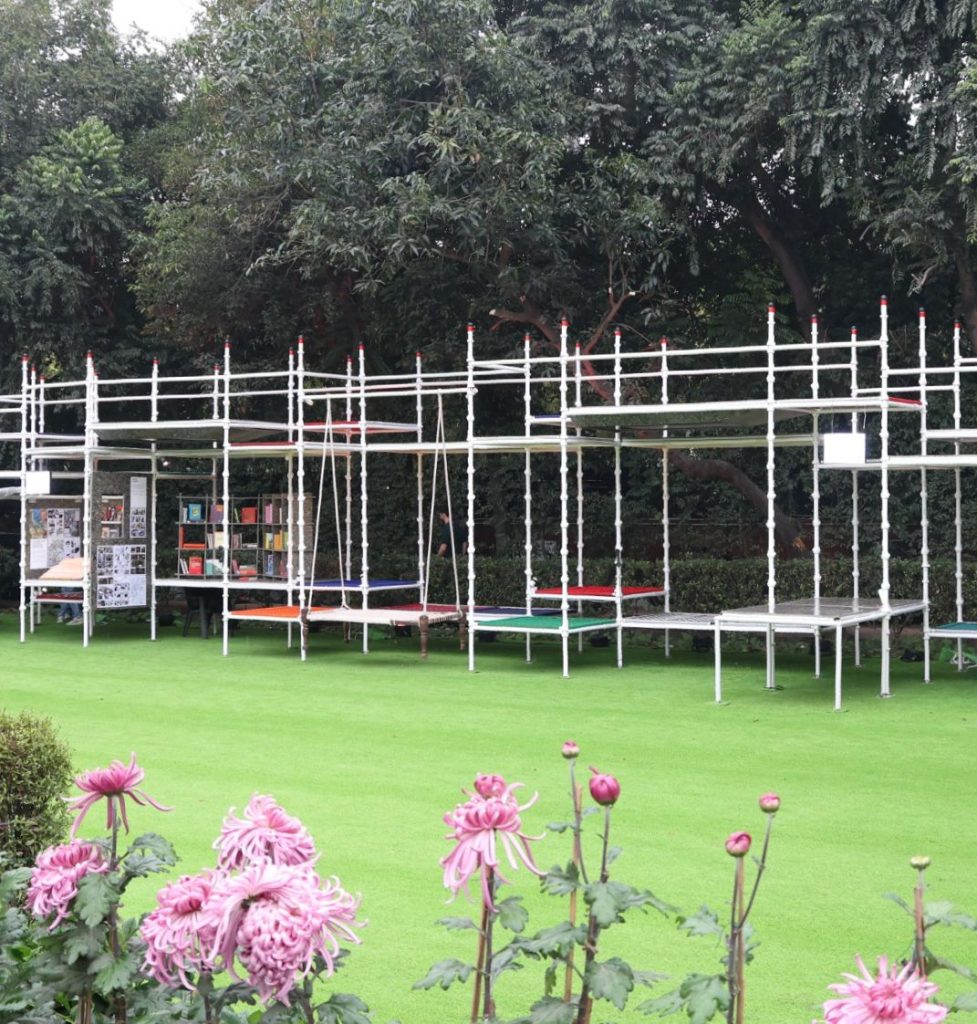 At the heart of the evening was The Charpai Project, an immersive installation in the IFI gardens conceived by curators and designers Ayush Kasliwal and Ramayudh Sahu, originally commissioned for the Serendipity Arts Festival 2018. The modular structure, created with traditional artisans and multidisciplinary artist-designer Goji, features a canopy of hand-woven panels made from post-consumer food wrappers and ropes, alongside rigid panels fashioned from upcycled Tetra Paks, mounted on scaffolding to form a flexible, reconfigurable community space.