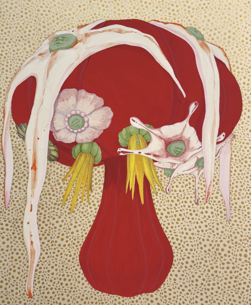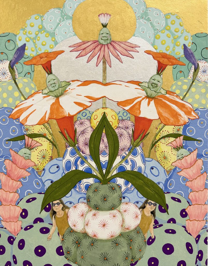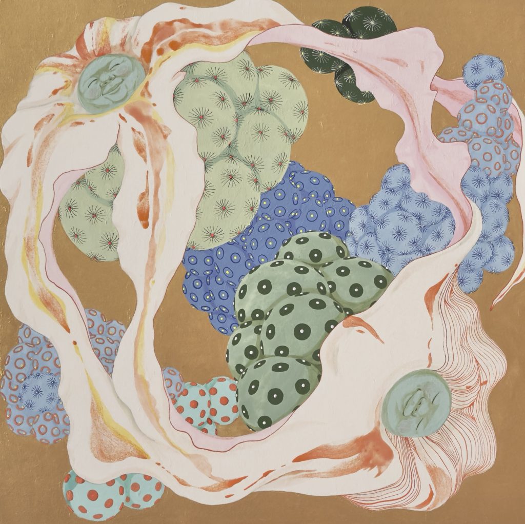 Ito says: “To visualise this multifaceted nature of desire, I paint many different facial expressions, symbolising the complex emotions that swirl within us. Just as our cells respond subtly when we feel emotions, plants also move and grow through the activity of their cells. The many dots, grains, and patterns in my work represent the invisible world, cells, bacteria, the movement of air, an attempt to make these unseen life forces visible.”