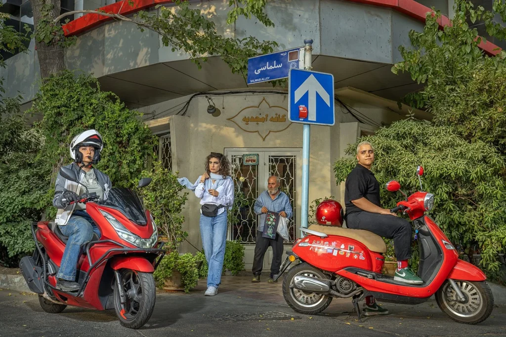 The series also includes women with dyed hair in vivid colours, blindfolded figures, women riding motorcycles through Tehran streets, and other images staging the collision between modernity and state-imposed tradition. The series’ text from Saeedpoor’s own hand captures the urgency: “We are citizens of this country (Iran), but we cry tears of blood. We are mourners. Iranian women are crying for freedom that they have been deprived of.”