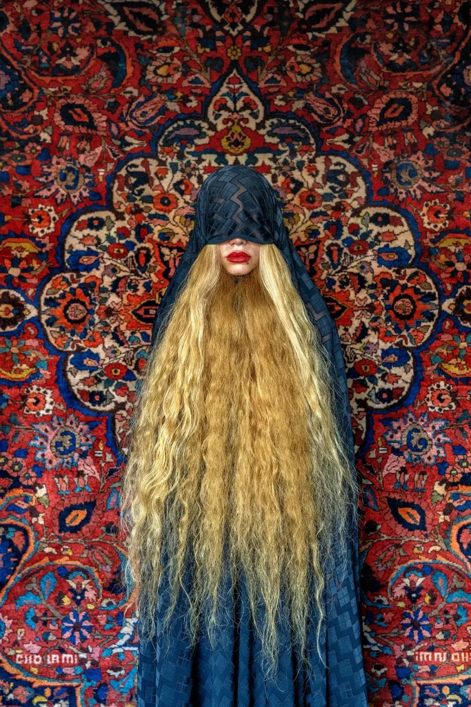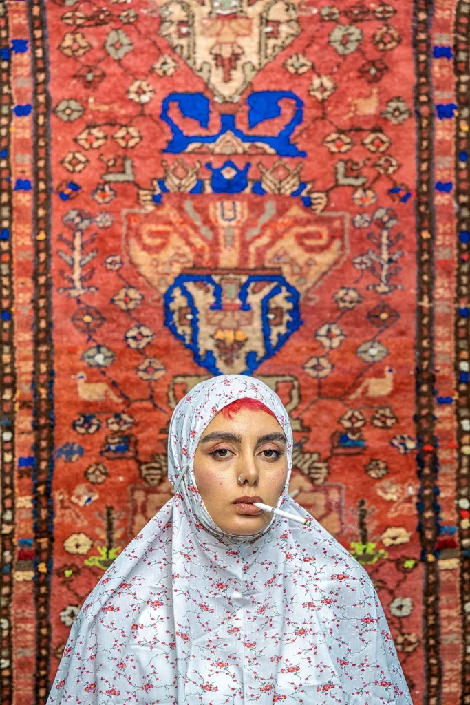 “This series was fueled by the anger and the fury that I felt in response to what was happening in our society during the Mahsa revolution. The Mahsa revolution was a really special thing in our society. It has affected and changed all of us and made huge waves through our society that I was responding to,” she explains. The photographs are theatrically staged studio portraits set against ornate Persian carpets and traditional textiles — symbols of Iranian domestic life repurposed as backdrops for acts of rebellion.