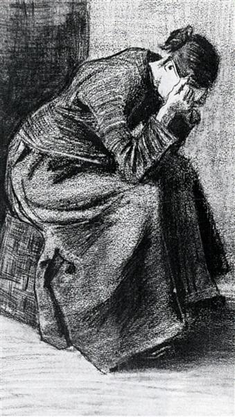 Drawing. European collections. A woman sits hunched, elbows on knees, head buried in her hands, her body language heavy and closed. Van Gogh reduces everything to bodily gesture, making her folded, inward-turned pose a stark image of everyday despair and exhaustion.