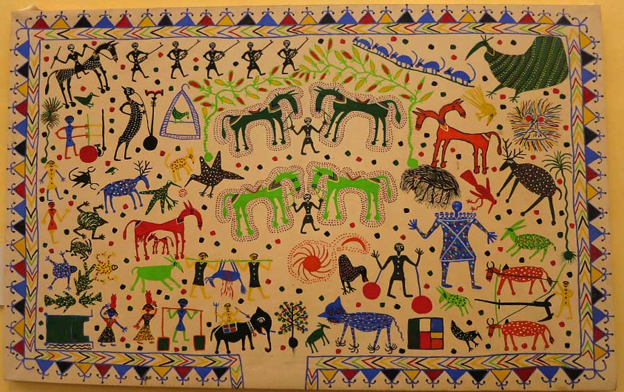 The central figure of Baba Pithora often appears on a horse, surrounded by other deities, ancestors and symbolic creatures.