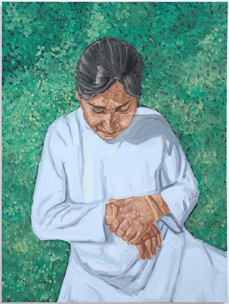 What draws you into a Raghav Babbar painting is not just the minute detailing in the painting, it is also the fact that the artist treats all of his subjects like the members of his family. In an interview with Artsy, Babbar confessed, “It’s a great experience when I get to have someone sit in front of me, as I get to know who they are very intimately”. Knowing their muses on a personal level is a famously followed ritual by artists of any background be it film directors and their actors or painters and their subjects. This particular feature in artworks by Babbar brings an inherent familiarity to not just the art itself but also the subject. The audience upon viewing his art gains an acquaintanceship with the subject. So when you gaze at his painting you’re not just watching an older woman looking down at her hands, you’re watching Dai Ma – a person the artist grew up with. Adorned with her ash grey hair, and wrinkles in her nurturing hands that exude wisdom, love and care.