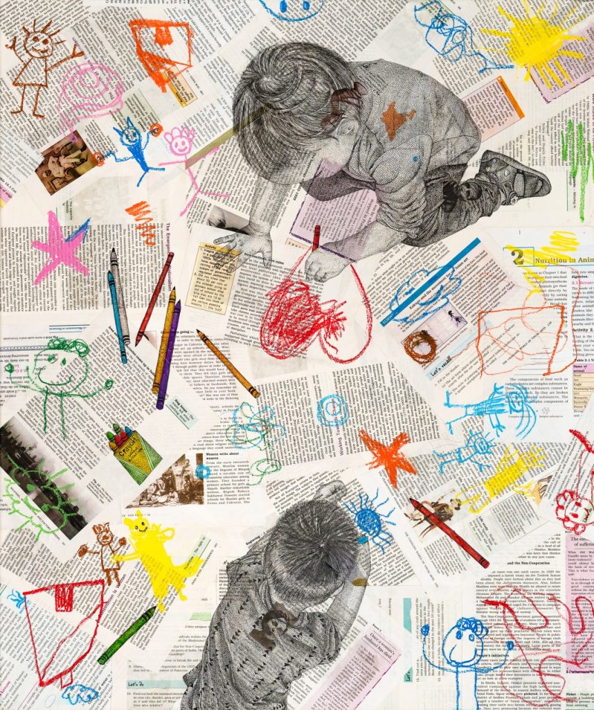 While their visual vocabularies differ, Gupta and Abhay share a commitment to patience and process. Gupta works extensively with pen and ink, expanding her practice into paper piercing, thread work, and fine sculptural interventions, constructing durational, monochromatic worlds that accumulate slowly through repetitive gesture. Her compositions, be they intimate scenes of daily life or symbolic meditations on presence reward sustained attention and invite contemplation.
