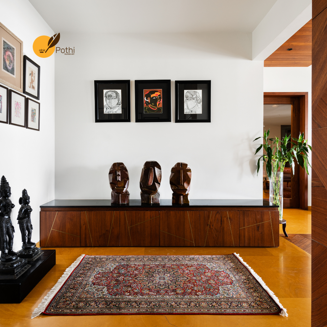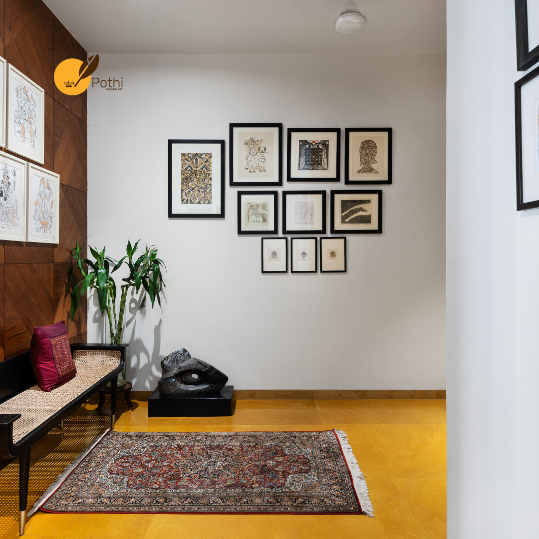 The lift opens into a private lobby adorned with plants and sculptures, setting a contemplative tone. A teakwood main door with a brass handle introduces a foyer where works by K. G. Subramanyam, ceramic plates by Jyoti Bhatt and Jyotsana Bhatt, and sculptural pieces create a layered visual experience over Jaisalmer stone flooring and a Kashmiri silk carpet.
