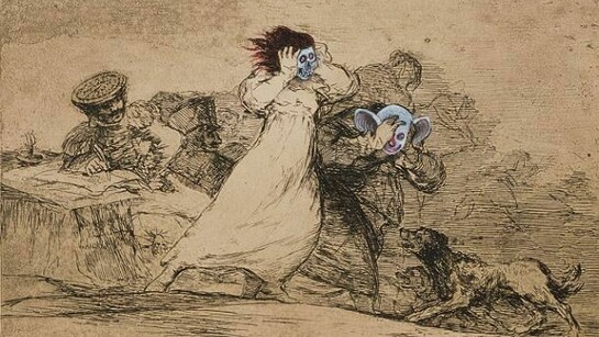 The duo returned to Goya in 2003, where they added funny faces to his paintings. In the April – June show titled ‘The Rape of Creativity’, the duo presented mint Goya etchings from his work ‘Disasters of War’, which they continuously defaced. This new piece was titled ‘Insult to Injury.’ The piece became headlining news, prompting performer Aaron Barschak to throw a can of red paint on Jake during a press conference.