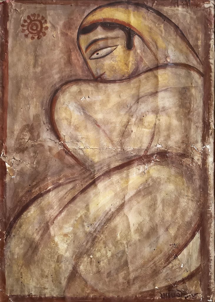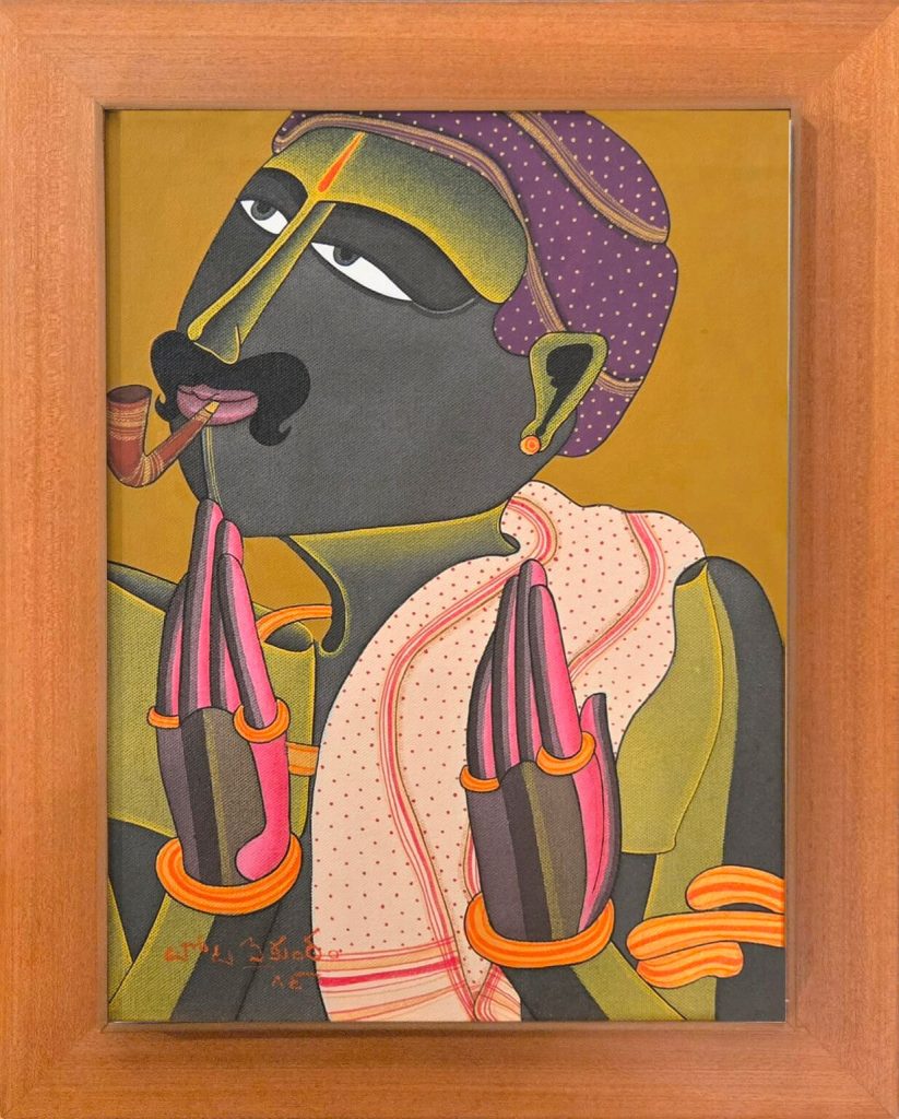 Jamini Roy (1887–1972), the pioneer who turned away from Western realism to embrace the folk vitality of Kalighat painting, sets the conceptual foundation for the exhibition. His mythological scenes and village figures, rendered in bold contour and earthy palette, continue to influence generations of artists seeking an indigenous modernism.